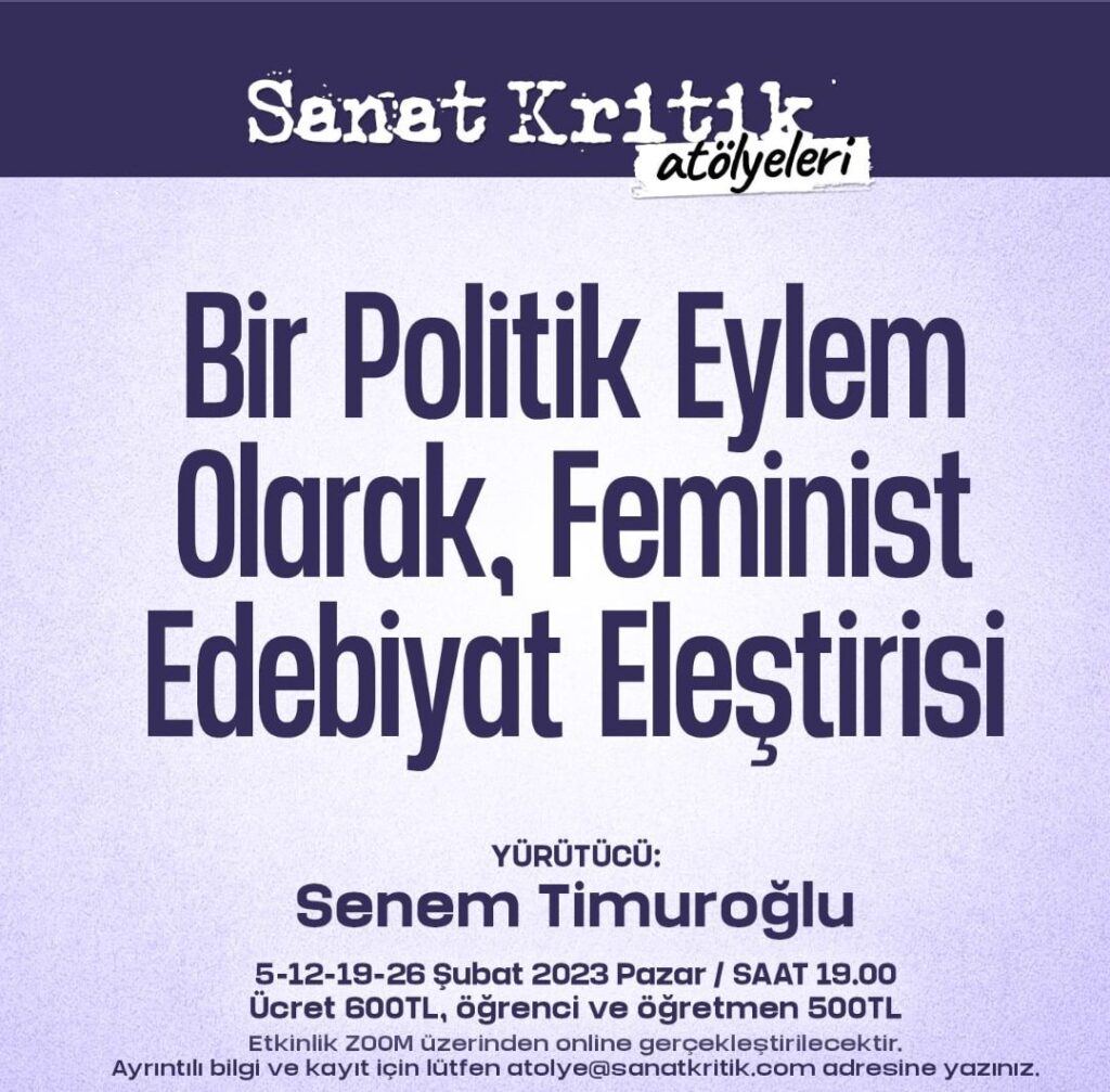 Senem Timuroğlu’nun yürüteceği “Bir Politik Eylem Olarak Feminist Edebiyat Eleştirisi” başlıklı çevrimiçi atölye, 5-26 Şubat tarihleri arasında Sanat Kritik tarafından düzenleniyor.
