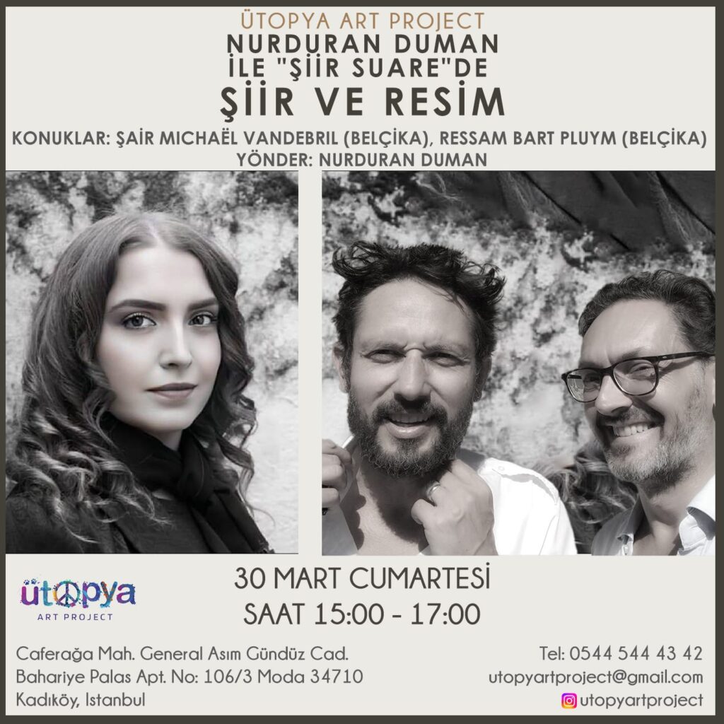 Daha önce “şiir ve ney” etkinliğiyle ABD/Pakistan, sonra Çin, Hindistan gibi ülkelerden şairleri konuk eden, şiirle birlikte diğer disiplinleri harmanlamayı gözeten, bu harmanın, bütüncül anlayışın dünyanın temel gereksinimlerinden olduğunu savunan etkinlik dizisinin bu ayağında resim sanatı ile şiir arasındaki ilişki irdelenecek. Belçikalı şair Michaël Vandebril ve Belçikalı ressam Bart Pluym’ın birlikte oluşturduğu ortak kitap odağında şiir, resim, gezi edebiyatı, arkeoloji, tarih, biyografi, tiyatro, güncel sanat ve daha birçok alanın nasıl birlikte çalışıp üretebildiği konuşulacak.