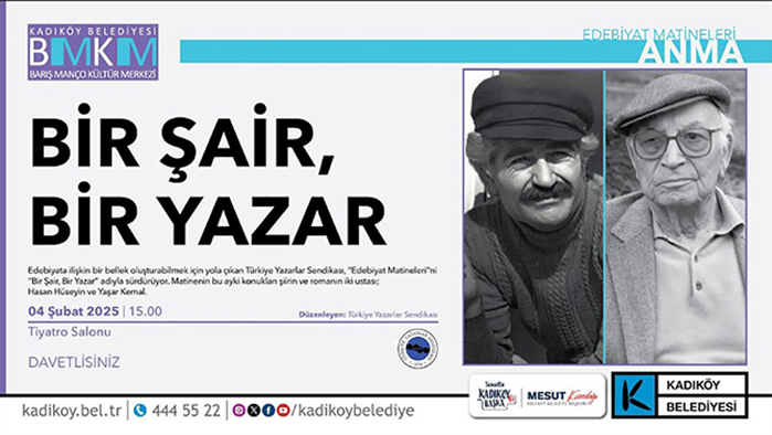 Türkiye Yazarlar Sendikası ve Kadıköy Belediyesi işbirliğiyle düzenlenen Edebiyat Matineleri, sendikanın 50. yılı dolayısıyla “Bir Şair, Bir Yazar” temasıyla devam ediyor. Bu anlamlı etkinlikte, Türk edebiyatının önemli isimleri Şair Hasan Hüseyin Korkmazgil ve Yazar Yaşar Kemal anılacak. Etkinlik 4 Şubat Salı günü, saat 15.00’te Barış Manço Kültür Merkezi’nde gerçekleşecek.