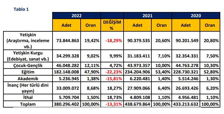 2022 yılında Edebiyat sanat kitapları, çocuk ve gençlik kitapları, inanç kitapları ve ithal yayınlarda büyüme var, üretim sayıları artmış. Ama yetişkinlere yönelik araştırma, inceleme kitapları, akademik yayınlar ve eğitim alanındaki kitaplarda ciddi düşüşler var.
