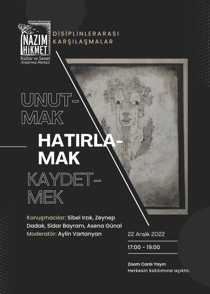 “Unutmak, Hatırlamak, Kaydetmek” paneli 22 Aralık perşembe 17.00’de çevrimiçi olarak Nâzım Hikmet Kültür ve Sanat Araştırma Merkezi tarafından düzenleniyor.