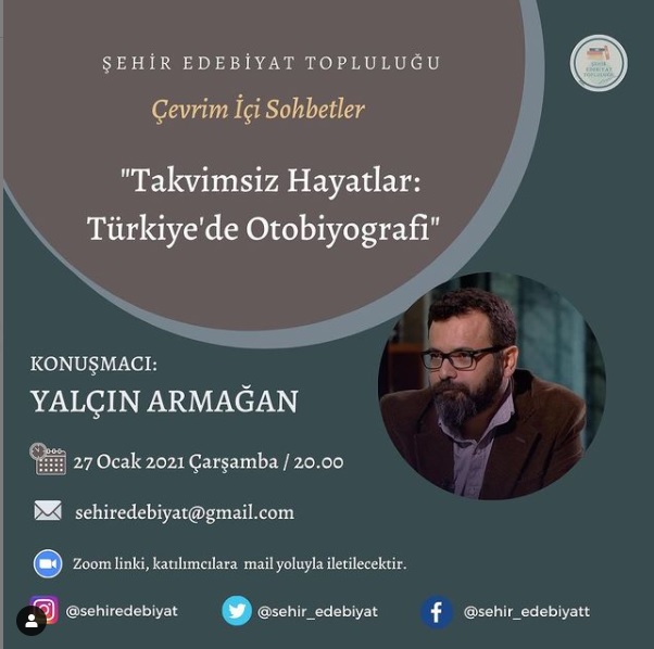 Şehir Edebiyat Topluluğu, “Çevrim İçi Sohbetler” serisine devam ediyor. Serinin yeni programı akademisyen-yazat Yalçın Armağan’ın katılımıyla “Takvimsiz Hayatlar: Türkiye’de Otobiyografi” başlığı altında gerçekleşecek.