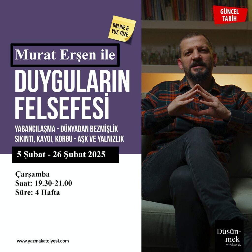 Strasbourg Marc Bloch ve Galatasaray Üniversitesi’nde felsefe (lisans, yüksek lisans) okumuş, Jean Moulin Lyon III Üniversitesi’nde “Ortaklık” (Communauté) üzerine siyaset felsefesi doktora çalışması yürütmüş. Uzun süredir yayıncılık dünyasında çevirmen, editör ve danışman olarak faaliyet gösteren, özellikle felsefe alanında Fransızca ve İngilizce’den seksenden fazla kitabı Türkçeye kazandırmış olan Murat Erşen, Duyguların Felsefesi atölyesiyle Şubat ayında da bizlerle. Atölyenin temaları yabancılaşma, dünyadan bezmişlik, sıkıntı, kaygı, korku, aşk ve yalnızlık olacak ve dört hafta sürecek.