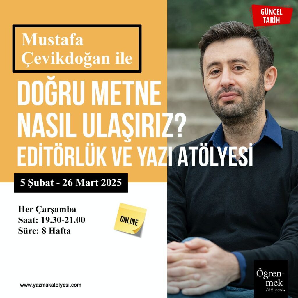 Günümüz yayın dünyasında editörün rolünün ele alınacağı, Türkçe yazılmış kitaplar üzerinde yapılan editörlük çalışmalarının uygulamalarla gösterileceği, yazarın kaleme almaya başladığı andan, kitabın okurun eline ulaştığı âna kadar geçen tüm süreçleri yayınevi pratiği üzerinden aktarılacağı Mustafa Çevikdoğan ile Doğru Metne Nasıl Ulaşırız? / Editörlük ve Yazı Atölyesi Şubat ayında yeniden bizlerle. Atölyede özellikle editörün rolü, mesleğe dair genel kavramları, temel kaynakları ve sık yapılan hataları inceleyecekler. Klasik yazarlardan günümüz genç yazarlarına kadar farklı dönemlere ve türlere ait metinlerin yayına hazırlanırken dikkat edilmesi gereken noktaları, karşılıklı örnek çalışmalarla ele alınacak.