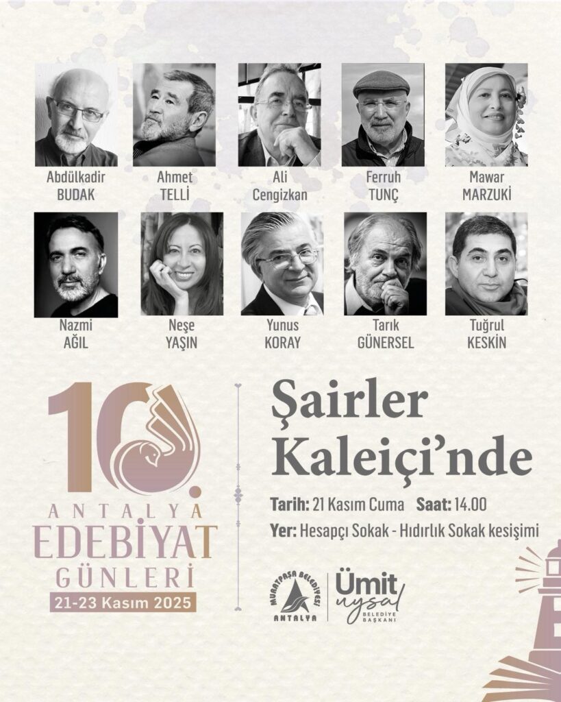 Antalya Edebiyat Günleri, 10’uncu yılında Kaleiçi’nde şairleri bir araya getirecek. Abdülkadir Budak, Ahmet Telli, Ali Cengizkan, aynı zamanda etkinliğin gönüllü sanat yönetmenliğini yapan Ferruh Tunç, Mawar Marzuki, Nazmi Ağıl, Neşe Yaşın, Yunus Koray, Tarık Günersel ve Tuğrul Keskin Kaleiçi’nde şiirlerini seslendirecek. Hesapçı ve Hıdırlık sokaklarının kesiştiği noktada düzenlenecek “Şairler Kaleiçi’nde” başlıklı dinleti saat 14.00’te başlayacak.
