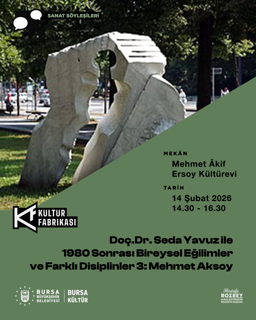 Bursa’yı bir sanat merkezi hâline getirmeyi hedefleyen Bursa Kültür’ün Kültür Fabrikası’nda düzenlediği “1980 Sonrası Bireysel Eğilimler ve Farklı Disiplinler” başlıklı Sanat Söyleşileri serisinde Doç. Dr. Seda Yavuz, Türkiye’de 1950’den günümüze sanat yaklaşımını inceliyor. 14 Şubat 2026 Cumartesi günü 14.30’da Mehmet Âkif Ersoy Kültürevi’nde gerçekleşecek üçüncü buluşma, 1980 sonrası Türk heykel sanatında bireysel eğilimler ve disiplinlerarası yaklaşımları, heykeltıraş Mehmet Aksoy odağında mercek altına alacak. Doç. Dr. Seda Yavuz söyleşide, sanatçının üretimlerini dönemsel ve kavramsal bağlamlarıyla değerlendirecek.