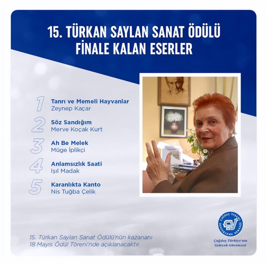 15. Türkan Saylan Sanat Ödülü’nde finale kalan eserler belli oldu Mayıs 8, 2024 yazar edebiyathaber 15. Türkan Saylan Sanat Ödülü Finale Kalan Eserler belli oldu. Kazanan, 18 Mayıs 2024 tarihinde açıklanacak. edebiyathaber.net (8 Mayıs 2024) İlkyaz Genç Yazarlar 2023 Kısa Öykü Başvurusu ve Şiir Başvurusu devam ediyorİzmir Uluslararası Film ve Müzik Festivali’nin kazananı 'Sen Ben Lenin' oldu“Attila İlhan Şiir Ödülü” başvuruları açıldıTürkiye Yayıncılar Birliği 2020 Düşünce ve İfade Özgürlüğü Ödülleri verildiAydın Doğan Ulusal Çizgi Roman ve Çocuk Kitabı İllüstrasyonu Ödülleri için başvurular 15 Mart’ta baş...Nobel Edebiyat Ödülü için bahisler açıldı: O isim yine favori