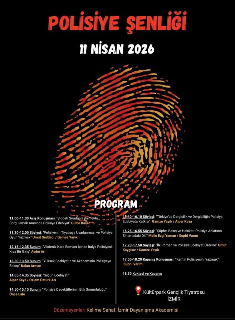 İzmir’de polisiye edebiyat meraklılarını buluşturacak olan 2. İzmir Polisiye Şenliği, 11 Nisan 2026 Cumartesi günü Kültürpark’taki Konak Gençlik Tiyatrosu’nda gerçekleştirilecek. Etkinlik, Kelime Sahaf ve İzmir Dayanışma Akademisi’nin iş birliğiyle düzenleniyor. Polisiye yazarları ile okurlarını bir araya getirecek etkinlik, söyleşi ve sunumlarla ülkemizde ve dünyada polisiye anlatının izini sürmeyi hedefliyor.