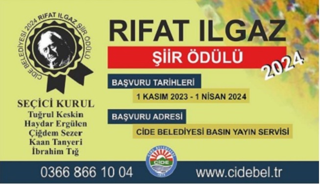 Cide Belediye Başkanlığı’nın 2024 Rıfat Ilgaz Şiir Yarışması’nın başvuruları açıldı. Yarışmanın son başvuru tarihi: 15 Nisan 2024.