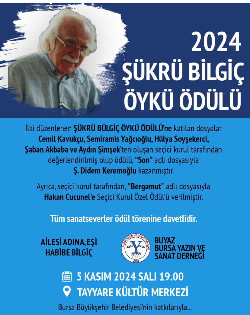 Ödül töreni, 5 Kasım 2024 tarihinde Şükrü Bilgiç ailesi, Bursa Büyükşehir Belediyesi ve BUYAZ’ın katkılarıyla gerçekleştirilecek.