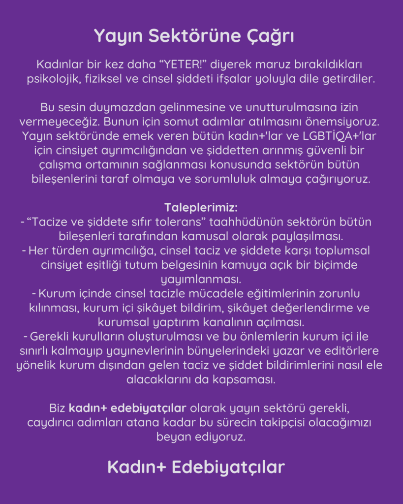 Biz kadın+ edebiyatçılar olarak yayın sektörü gerekli, caydırıcı adımları atana kadar bu sürecin takipçisi olacağımızı beyan ediyoruz.