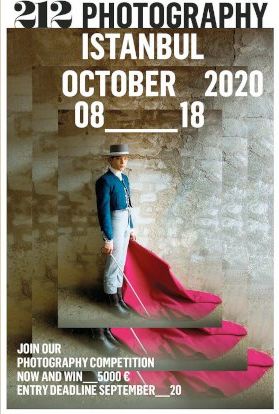 Bu yıl üçüncüsü düzenlenecek 212 Photography İstanbul, 8-18 Ekim 2020 tarihleri arasında 5 farklı mekanda gerçekleşecek. 10 gün boyunca sürecek olan festival, çok sesli, multidisipliner yapısıyla farklı bir tartışma ve buluşma platformu yaratmayı amaçlıyor.