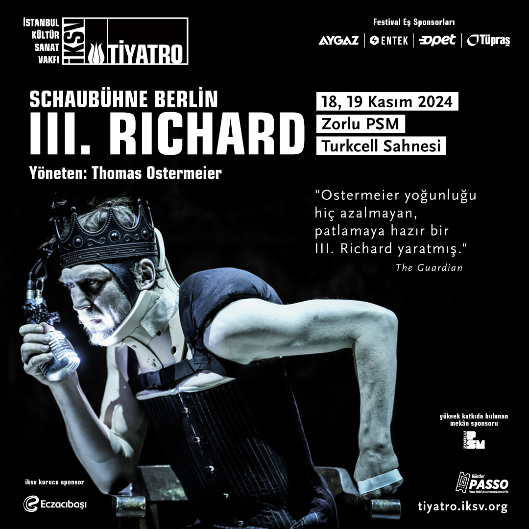 Festivale her gelişi büyük heyecan yaratan topluluk Schaubühne Berlin ise, on yılın ardından yönetmen Thomas Ostermeier’in yönetiminde, yıldız oyuncu Lars Eidinger’in başrolünde oynadığı III. Richard’ı 18 ve 19 Kasım tarihlerinde Zorlu PSM sahnesine taşıyacak. MeylDiageo’nun katkı sağlayan kuruluş olarak destek verdiği gösteri, Zorlu PSM’nin yüksek katkıda bulunan mekân sponsorluğunda gerçekleşecek.