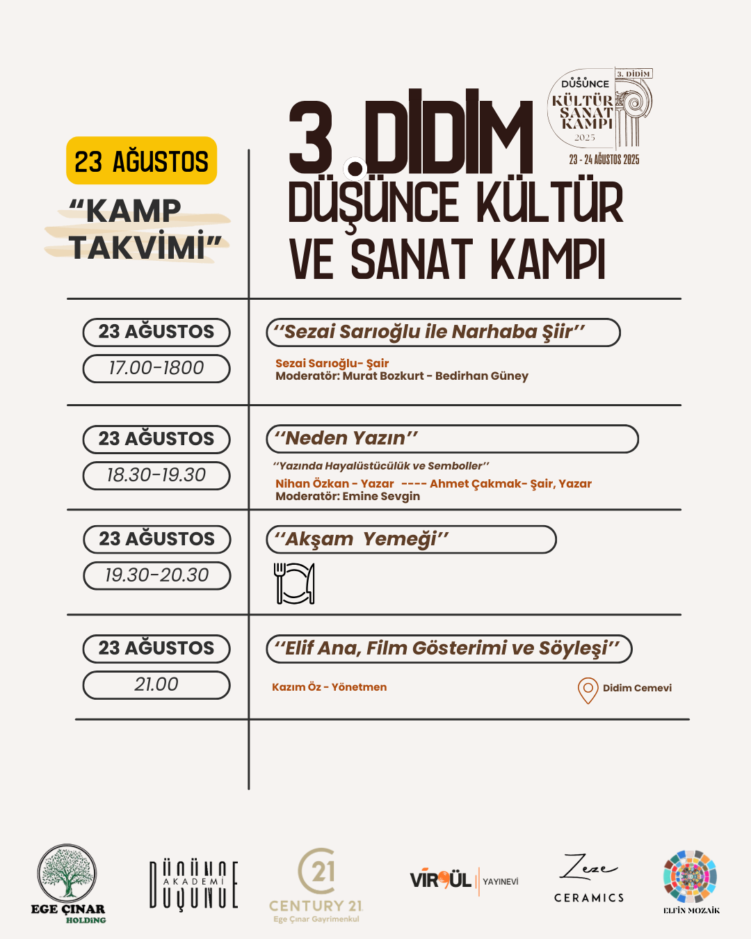 bu sene 3.sü düzenlenecek olan Didim Düşünce Kültür ve Sanat Kampı 23 ve 24 Ağustos’ta misafirlerini ağırlayacak. Birbiriyle konuşabilen, birbirini dinleyebilen insanlar ancak birbirlerinin hassasiyetlerini anlayabilir ve daha iyi bir dünyanın kapılarını açabilirler. Ben değil, biz şiarıyla; ben bilirim değil, beraberce bir çözüm bulabiliriz anlayışıyla yolumuza devam ediyoruz. Düşünce Kültür ve Sanat Kampı evrensel değerleri ön planda tutan bir tavırla; hiçbir gerici olguya, cinsiyetçi tavra, ötekileştirici hükme ve elitist yaklaşıma yer vermeden yoluna devam ediyor.
