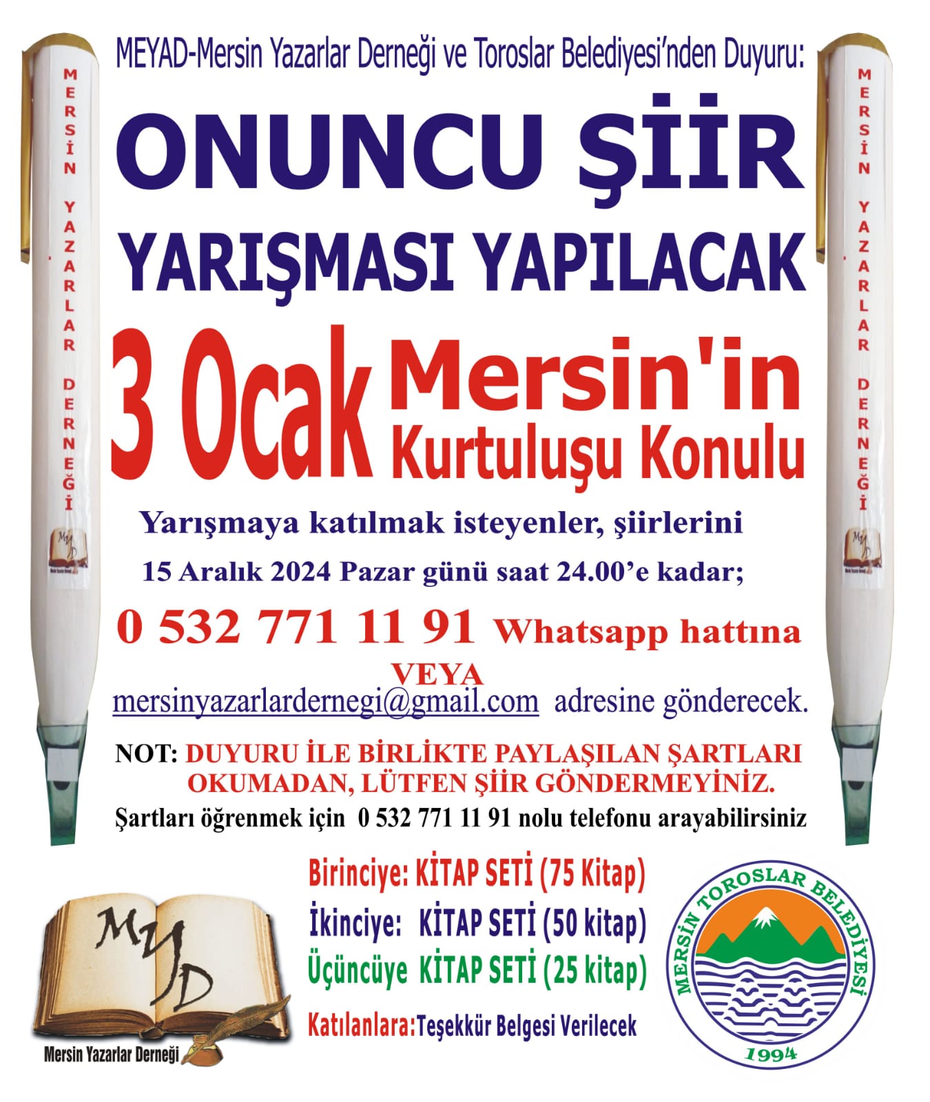 Mersin Yazarlar Derneği’nin Mersin Şiir Yarışması için başvurular açıldı. Yarışmanın konusu “3 Ocak Mersin’in Kurtuluşu” olarak belirlendi. Yarışma koşulları: