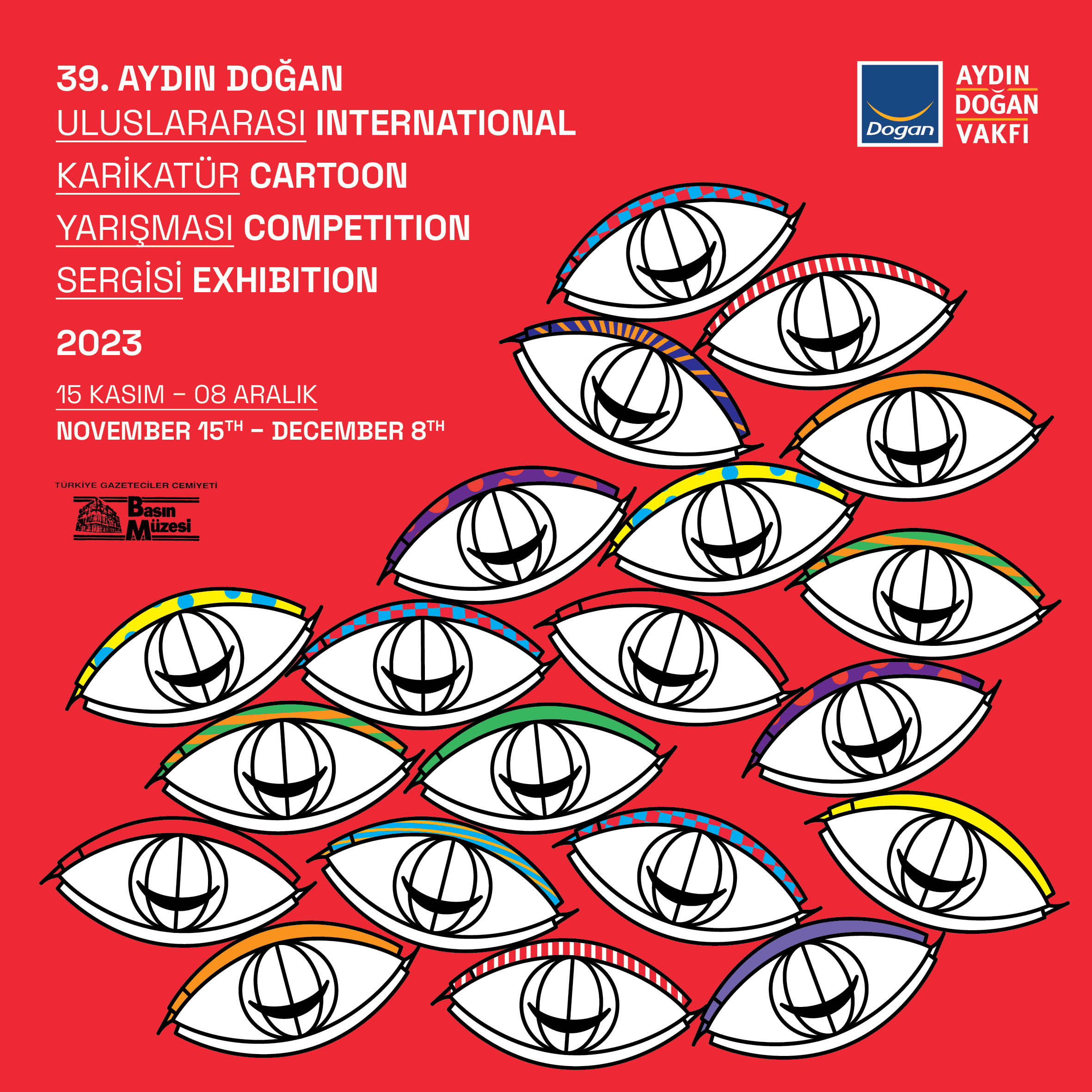 39. Aydın Doğan Uluslararası Karikatür Yarışması’nda ilk üç ödülün sahibi olan Polonya’dan sanatçı Pawel Kuczynski, Kolombiya’dan sanatçı Elena Ospina, Türkiye’den sanatçı Halit Kurtulmuş Aytoslu, Güçlü Kızlar Güçlü Yarınlar özel ödülünün sahibi Oğuzhan Çiftçi ve başarı ödüllerinin sahipleri Çin Halk Cumhuriyeti’nden Xiaoqiang Hou, Polonya’dan Zygmunt Zaradkiewicz ve Türkiye’den Muhammet Şengöz’ün eserlerinin yanı sıra sergilenmeye değer görülen eserler, 8 Aralık’a kadar Türkiye Gazeteciler Cemiyeti Basın Müzesi’nde sanatseverlerin ziyaretine açık olacak.