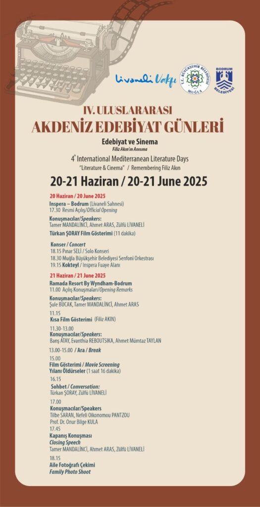 Muğla Büyükşehir Belediyesi, Bodrum Belediyesi ve Livaneli Vakfı iş birliğiyle bu yıl dördüncüsü düzenlenen Uluslararası Akdeniz Edebiyat Günleri, 20-21 Haziran tarihlerinde Bodrum’da edebiyat ve sanat dünyasını bir araya getirecek. Bu yıl etkinlik, 82 yaşında hayatını kaybeden usta oyuncu Filiz Akın’ın anısına düzenleniyor.