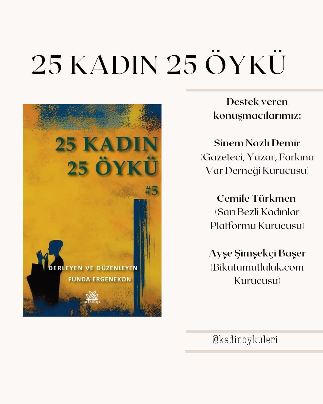 “25 Kadın 25 Öykü” kitabı kadınların geçmişten bugüne süregelen var olma mücadelesini, hayallerini ve yaşanmışlıklarını kayıt altına alan kolektif bir çalışmadır. Kadın Öyküleri Platformu bu kitabın ilham verecek yeni hikâyelere kapı aralamasını diliyor ve tüm edebiyatseverleri bu güçlü anlatılara ortak olmaya davet ediyor. Katılım ücretsizdir. Kadınların sesini ve hikâyelerini duyurmaya katkı sunan tüm destekçilerimize teşekkür ederiz.