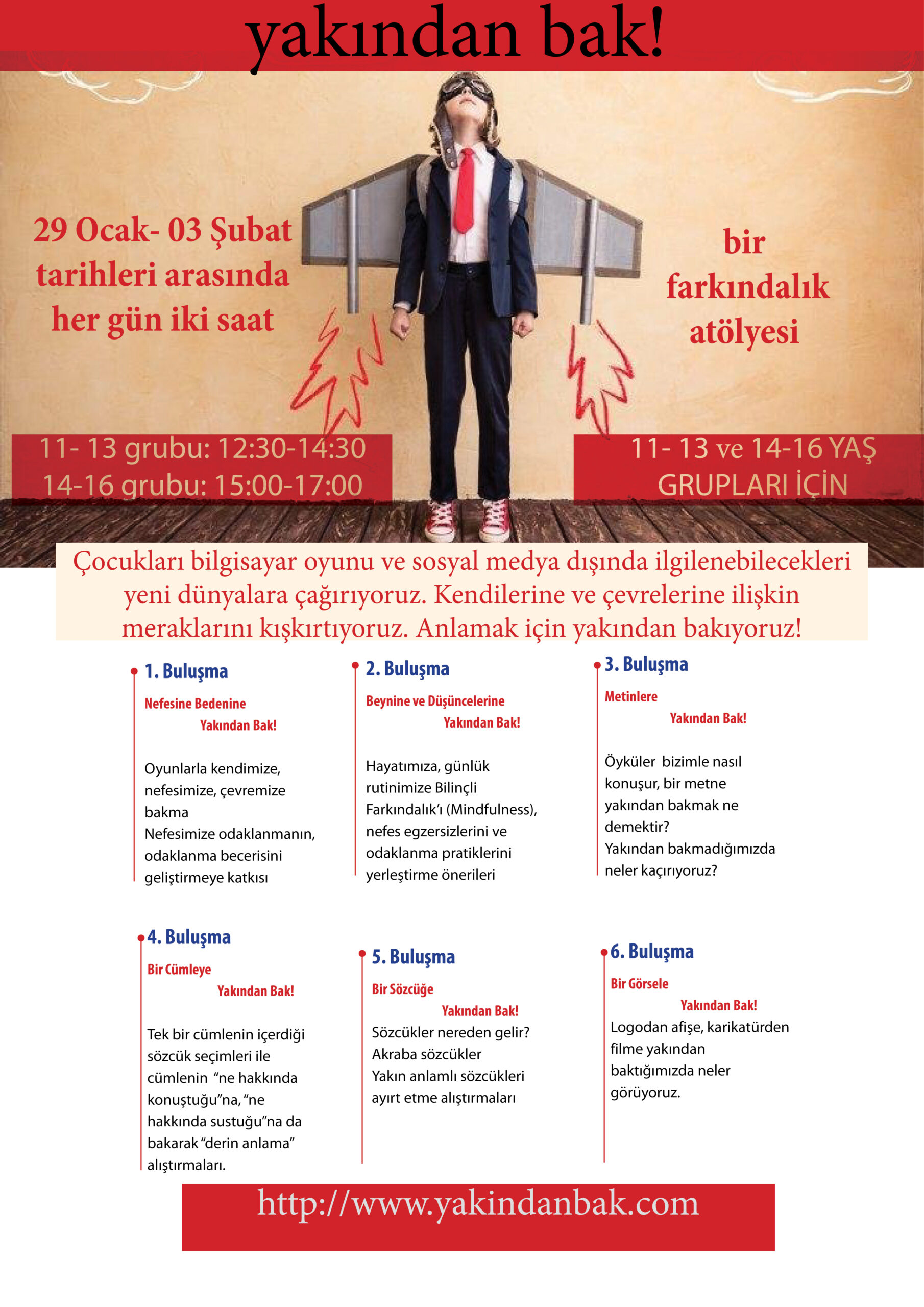 Bir farkındalık çalışması olan “Yakından Bak!”ın ilk atölyesi, 9-16 yaş grubuna yönelik olarak oluşturuldu. Atölye çalışmaları 29 Ocak – 3 Şubat arasında gerçekleşecek ve her gün 2 saat olacak.