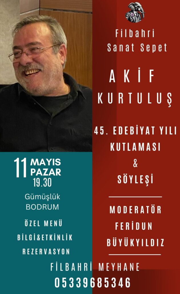 Bu yıl 45. Edebiyat Yılı’nı kutlayan şair Akif Kurtuluş, 11 Mayıs’ta Bodrum Filbahri Sanat Sepet’te okurlarıyla buluşuyor. Feridun Büyükyıldız’ın moderatörlüğünü üstleneceği etkinlik saat 19.30’da.