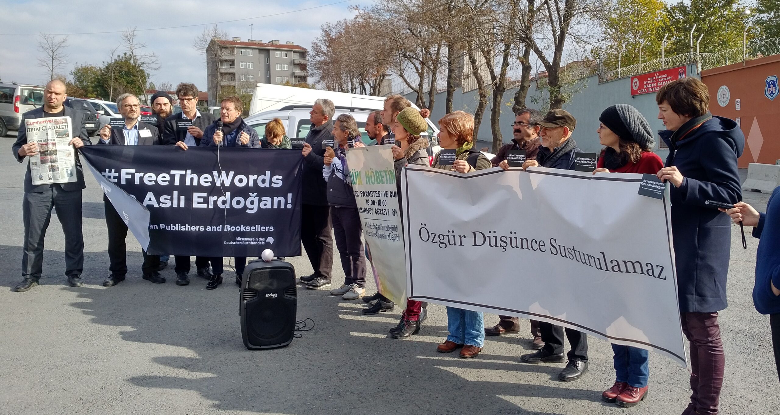 Cumhuriyet’e yaptıkları destek ziyaretinden hemen sonra Bakırköy Kadın Kapalı Cezaevi önüne gelen ekip, burada Links Verlag, Arco Verlag, The Orient gibi bazı yayınevi temsilcileri ve Alman yazarlarla buluşarak her Pazartesi ve Cuma (saat 15:00-18:00 arası) gerçekleştirilen “Özgürlük Nöbeti” öncesinde, getirdikleri pankart ve kartlarla bir basın açıklamasında bulundular.