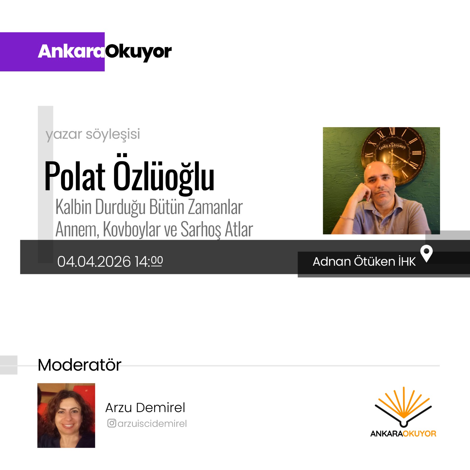 Moderatörlüğünü, Ankara Okuyor’ un kurucusu Arzu Demirel’ in üstlendiği söyleşi, 4 Nisan’ da Adnan Ötüken Kütüphanesi’ nde saat 14.00’te gerçekleşecek.