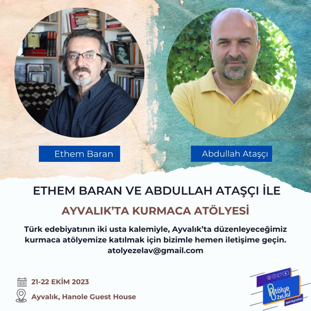 Ödüllü yazarlar Ethem Baran ve Abdullah Ataşçı ile Kurmaca Atölyesi 21-22 Ekim tarihinde Atölye ZeLAV tarafından Ayvalık Hanole Guest House’ta düzenleniyor.
