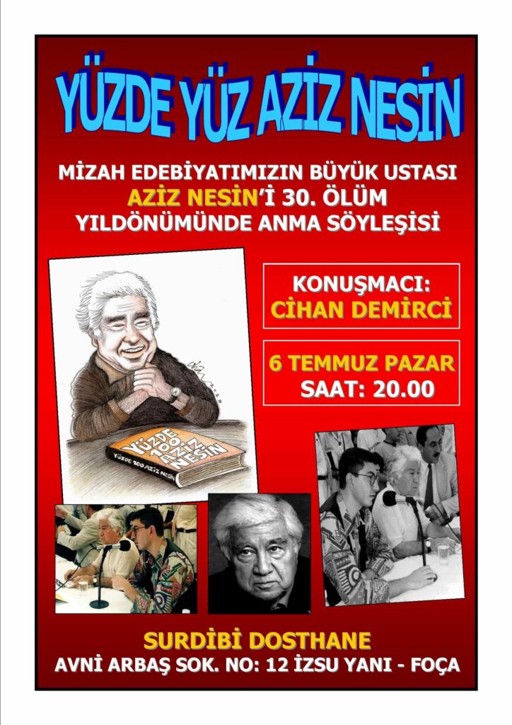 Mizah edebiyatımızın büyük ustası Aziz Nesin, yaşadığı Sivas Katliamı acısının üzerinden 2 yıl kadar sonra 6 Temmuz 1995’te hayata veda etmişti. Aziz Nesin son konuşmalarını Foça ve Çeşme Alaçatı’da yaptı. Ustası saydığı Aziz Nesin’le genç yaşında birlikte çalışma onuru yaşayan, ölümünden 19 önce de İzmit’te ortak bir söyleşide bir araya gelen mizah yazarı-çizer-mizah tarihi araştırmacısı Cihan Demirci, 6 Temmuz Pazar günü, Foça’nın yeni mekanı Surdibi Dosthane’de Aziz Nesin’i görsel sunumlu özel bir söyleşiyle anacak.
