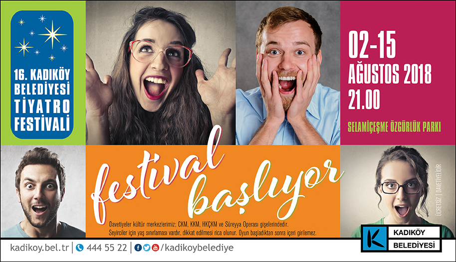 Kadıköy Belediyesi Tiyatro Festivali 2 Ağustos’ta başlıyor. İki hafta sürecek festivalde 14 oyun ücretsiz sahnelenecek ve yoğun ilgi nedeniyle davetiyeli olarak izlenecek. Oyun davetiyeleri, her bir oyunun etkinlik günü 13:00 – 18:00 saatleri arasında, Kadıköy Belediyesinin Caddebostan Kültür Merkezi, Kozyatağı Kültür Merkezi, Süreyya Operası ve Halis Kurtça Çocuk Kültür Merkezi gişelerinden alınabilecek.