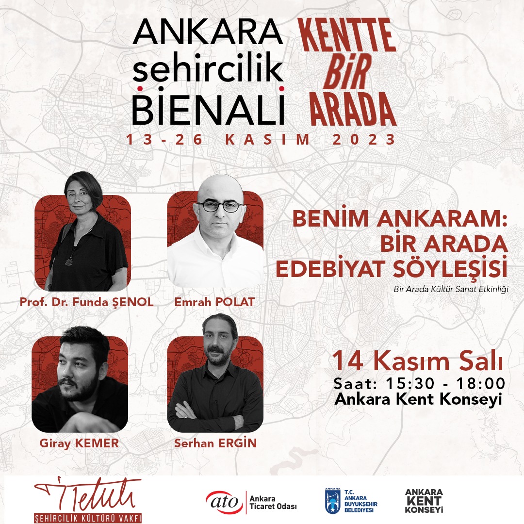 İlhan Tekeli Şehircilik Kültürü Vakfı tarafından 13-26 Kasım tarihleri arasında düzenlenecek “Ankara Şehircilik Bienali, Kentte Bir Arada” etkinlik temalarından biri de edebiyat üzerine gerçekleşecek. Prof. Dr. Funda Şenol, Emrah Polat, Giray Kemer ve Serhan Ergin’in konuşmacı olarak katılacağı “Benim Ankaram: Bir Arada Edebiyat Söyleşisi” 14 Kasım saat 15.30’da Ankara Kent Konseyi’nde başlayacak.