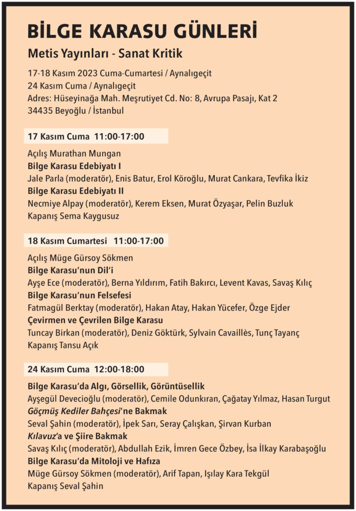 Bilge Karasu anısına Metis Yayınları ve Sanat Kritik’in düzenlediği Bilge Karasu Günleri 17-18 ve 24 Kasım’da gerçekleşecek.