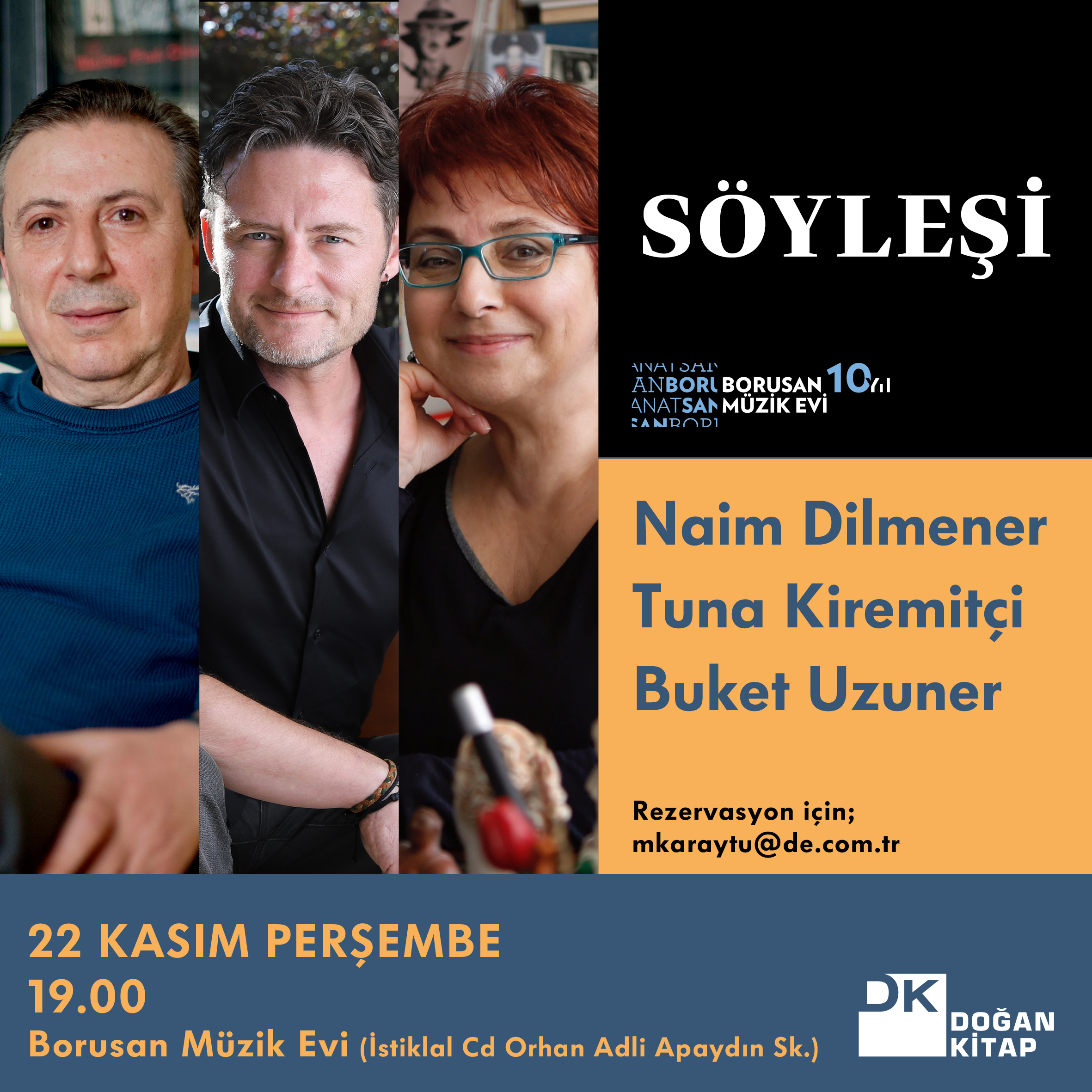 Müzik eleştirmeni, DJ-yazar Naim Dilmener, yazar Buket Uzuner ve yazar-müzisyen Tuna Kiremitçi’nin müzik ve edebiyatın ayrılamaz bağları üzerine gerçekleştireceği söyleşi saat 19.00’da İstiklal Caddesi’nde bulunan Borusan Müzik Evi’nde gerçekleşecek.