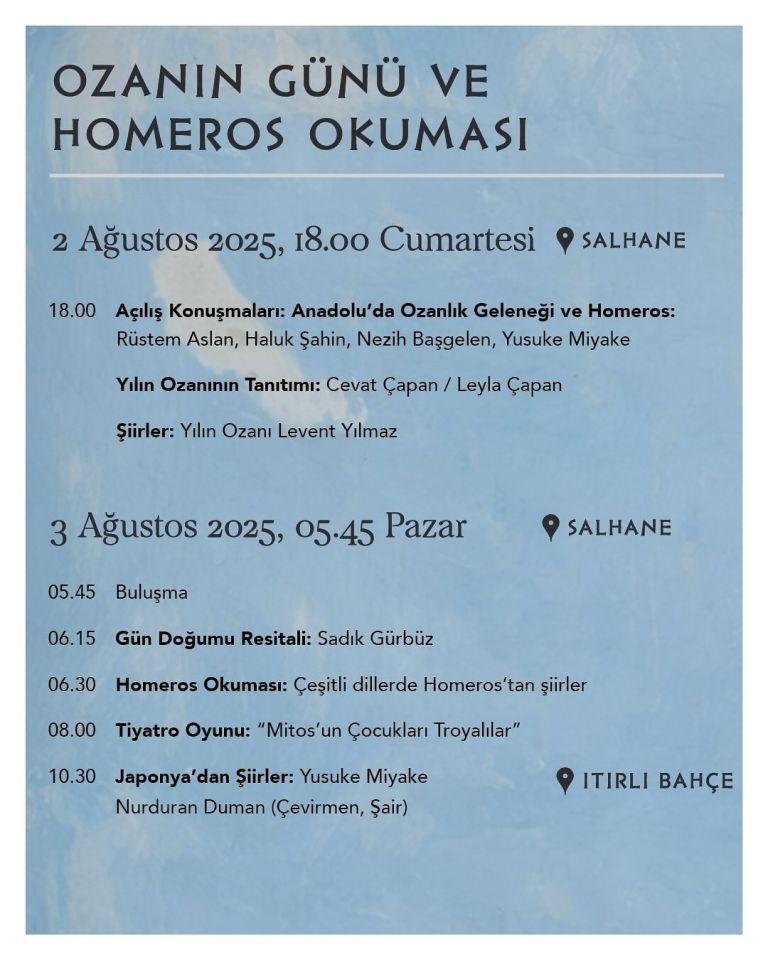 Bozcaada’da bu yıl Ozanın Günü ve Homeros Okuması’nın 24’ncüsü düzenlenecek. Bozcaada’da kültür ve sanat etkinlikleri hız kesmeden devam ediyor. Gerçekleştirecek olan etkinlikler kapsamında, bu yıl düzenlenen Ozanın Günü ve Homeros Okuması, 2–3 Ağustos 2025 tarihleri arasında gerçekleştirilecek.