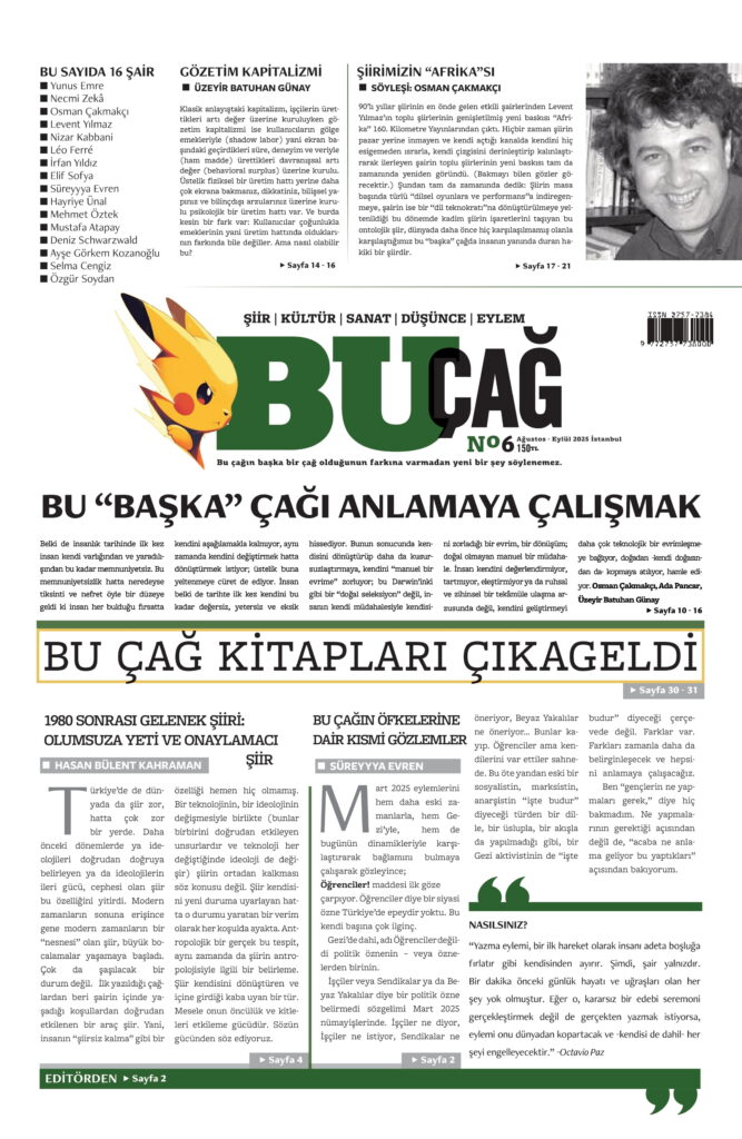 Bu Çağ dergisinin 6. sayısında “Bu ‘Başka’ Çağı Anlamaya Çalışmak” soruşturması konu edilmiş: “Belki de insanlık tarihinde ilk kez insan kendi varlığından ve yaradılışından bu kadar memnuniyetsiz. Bu memnuniyetsizlik, hatta neredeyse tiksinti ve nefret, öyle bir düzeye geldi ki insan her bulduğu fırsatta kendini aşağılamakla kalmıyor, aynı zamanda kendini değiştirmek hatta dönüştürmek istiyor; üstelik buna yeltenmeye cüret de ediyor. İnsan belki de tarihte ilk kez kendini bu kadar değersiz, beceriksiz, yetersiz ve eksik hissediyor.” denilerek özetlenen soruşturmaya dahil olan isimler ve öne çıkan başlıklar: “İnsanın Kendini Kendi Eliyle Değiştirmeye Cüret Ettiği Bir Çağ” (Osman Çakmakçı), “Hakikat Sonrası Çağ ve Şiir” (Ada Pancar), “Gözetim Kapitalizmi Bize Ne Yaptı” (Üzeyir Batuhan Günay), “30 Yıl Önce 30 Yıl Sonra” (Levent Yılmaz ile söyleşi). Öne çıkan diğer yazılar ise: “1980 Sonrası Gelenek Şiiri: Olumsuza Yeti ve Onaylamacı Şiir” (Hasan Bülent Kahraman), “Bu Çağın Öfkelerine Dair Kısmi Gözlemler” (Süreyyya Evren), “Ruh Uçuşması-Yaşantıdan Fışkıran Düşünceler” (Osman Çakmakçı), “İnsan Öleceğine Şiir Kalacağına İnanır” (Özgür Soydan), “Rusya-Almanya: Devrim Sonrasında Sanat ve Modernizm” (John Willett), “Dip Not: İki Dergi İki İsim” (Osman Çakmakçı), Bu Çağ Kitapları (Kitap Tanıtımları)