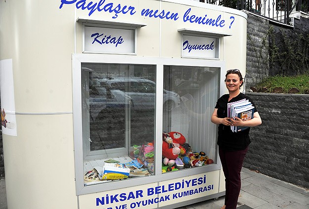 Niksar Belediyesinin “Kitap ve Oyuncak Kumbarası” projesi kapsamında, belediye binası önüne konulan kumbarada kitap ve oyuncak biriktiriliyor.