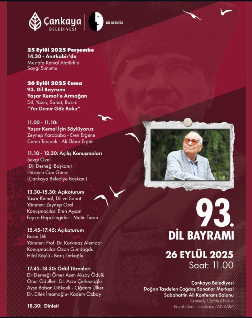 Çankaya Belediyesi, Dil Derneği işbirliğiyle 93. Dil Bayramı’nın kutlamaları kapsamında etkinliklere ev sahipliği yapacak. 25 Eylül’de Ulu Önder Gazi Mustafa Kemal Atatürk’ün ebedi istirahatgahı Anıtkabir’e yapılacak ziyaretle başlayacak olan program, 26 Eylül’de Doğan Taşdelen Çağdaş Sanatlar Merkezi’nde “Yaşar Kemal’e Armağan, Dil, Yazın, Sanat Basın: ‘Yer Demir Gök Bakır’” etkinliğiyle sürecek. Daha sonra “Yaşar Kemal İçin Söylüyoruz” etkinliğinde, Zeynep Karababa, Eren Ergene, Ceren Tercanlı, Ali Ekber Ergün sahne alacak. Dil Derneği Başkanı Sevgi Özel ve Çankaya Belediye Başkanı Hüseyin Can Güner’in açılış konuşmasını yapacağı etkinlik, şöyle devam edecek: