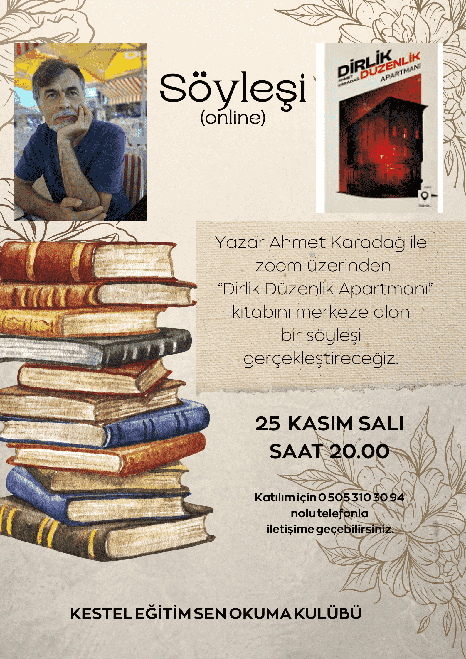 Bursa Kestel Eğitim Sen okuma kulübü, 25 Kasım 2025 salı günü saat 20.00’de yazar Ahmet Karadağ ile online söyleşide bir ...