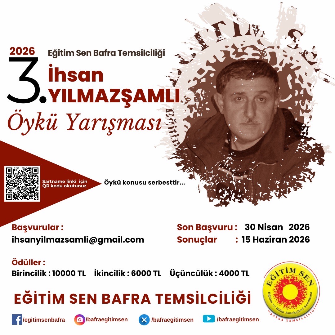 3.İhsan Yılmazşamlı Öykü Yarışması Başvuruları başladı. Yarışmaya son başvuru tarihi 30 Nisan 2026. Başvuru şartları: Eğitim Sen Bafra Temsilciliği olarak, ...