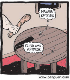 Ortaokul ve lise yıllarında “okuduğunuz bir hikayenin özetini çıkartın” konulu ödevlerle mükelleftik. Çıkartılan o özetler “copy-paste”ten öteye geçmez; hikayenin giriş, gelişme ve sonuç bölümlerinden alınan birkaç cümleyle halledilirdi. Penguen dergisi çizeri Cem Dinlenmiş de her hafta gündemin özetini çizgileriyle çıkartıyor. Ama “copy-paste” kolaycılığına kaçmadan, farklı bir üslupla…