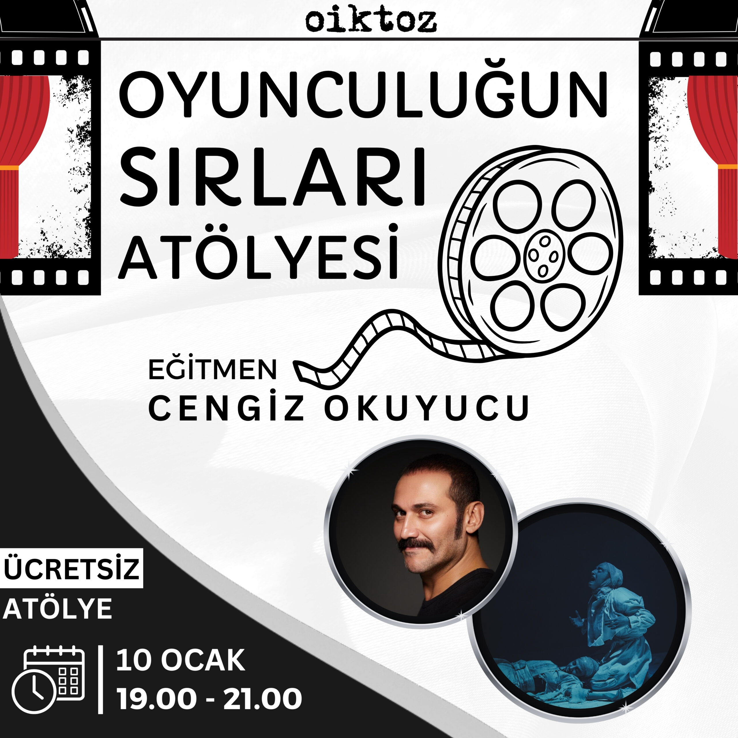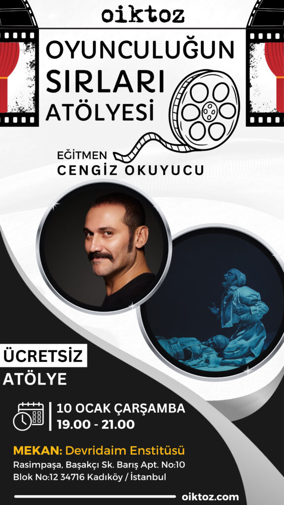 oiktoz akademi tarafından 10 Ocak Çarşamba günü, İstanbul Kadıköy Devridaim Enstitüsü‘nde “Oyunculuğun Sırları Atölyesi” gerçekleştirilecektir. Atölyede eğitmen olarak; birçok tiyatro oyunu, sinema filminde yer almış, usta oyuncu ve deneyimli eğitmen Cengiz Okuyucu yer alacaktır.