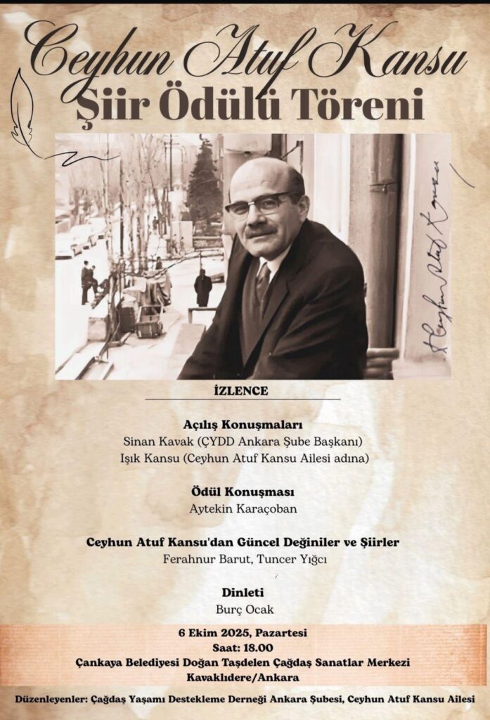Ceyhun Atıf Kansu Şiir Ödülü Töreni 6 Ekim’de Eylül 22, 2025 yazar edebiyathaber Ceyhun Atıf Kansu Şiir Ödülü Töreni 6 Ekim’de Ankara Çağdaş Sanatlar Merkezi’nde gerçekleşecek. Irmak Zileli ile Yaratıcı Yazarlık Atölyesi başlıyorVan'da II. Çocuk Edebiyat Fuarı başladıEleştirel Eğitim Dergisi "Dersler", birinci yaşını 1 Kasım'da kutluyorBursa 13. Kitap Fuarı sona erdiAkademi Jurnal'de Dramaturji ve Tiyatro Eleştirmenliği Atölyesi başlıyorCaddebostan Kültür Merkezi’nin bu haftaki konuğu Dr. Gülseren Budayıcıoğlu