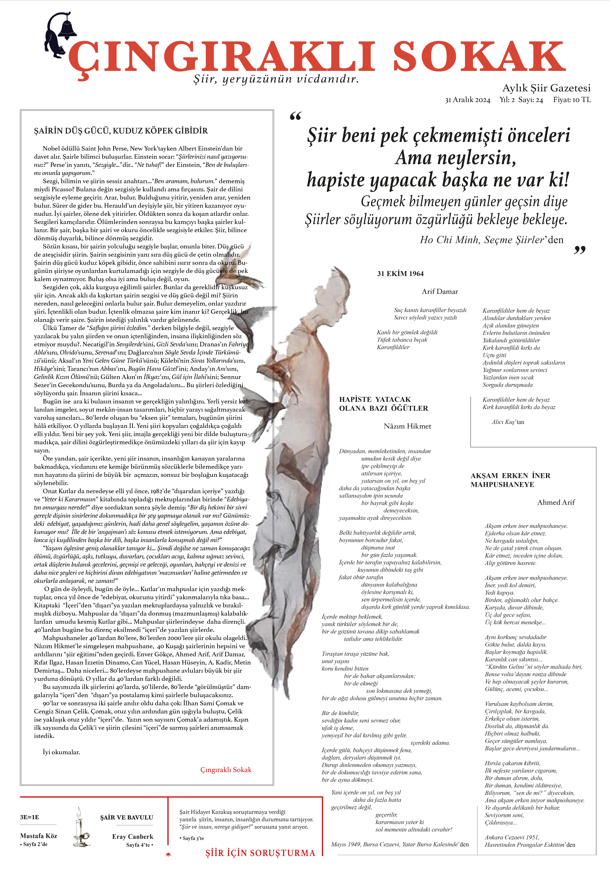 Çıngıraklı Sokak Aylık Şiir Gazetesi Aralık sayısı okuyucuyla buluştu. Gazete bu ay yüzünü dışarıdan “içeri”ye dönüyor. Edebiyatımızda yolu mahpustan geçmiş şairleri ve şiirleri satırlarına taşıyor.