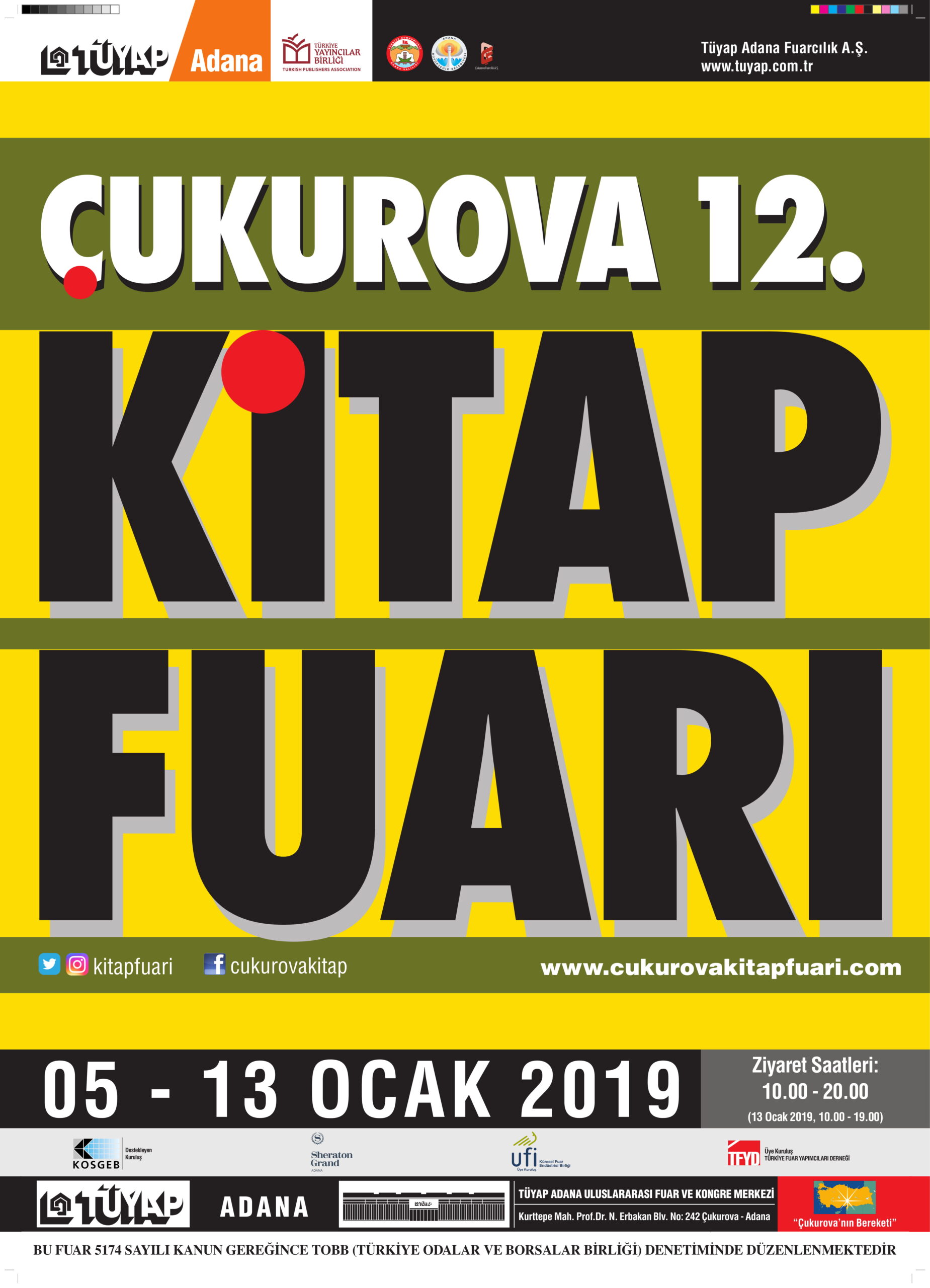 TÜYAP Adana Fuarcılık A.Ş. tarafından Türkiye Yayıncılar Birliği işbirliği, ÇUFAŞ Çukurova Fuarcılık A.Ş., Adana Valiliği ve Adana Büyükşehir Belediyesi desteği ile düzenlenen Çukurova 12. Kitap Fuarı, 5-13 Ocak 2019 tarihleri arasında TÜYAP Adana Uluslararası Fuar ve Kongre Merkezi’nde gerçekleştirilecek.