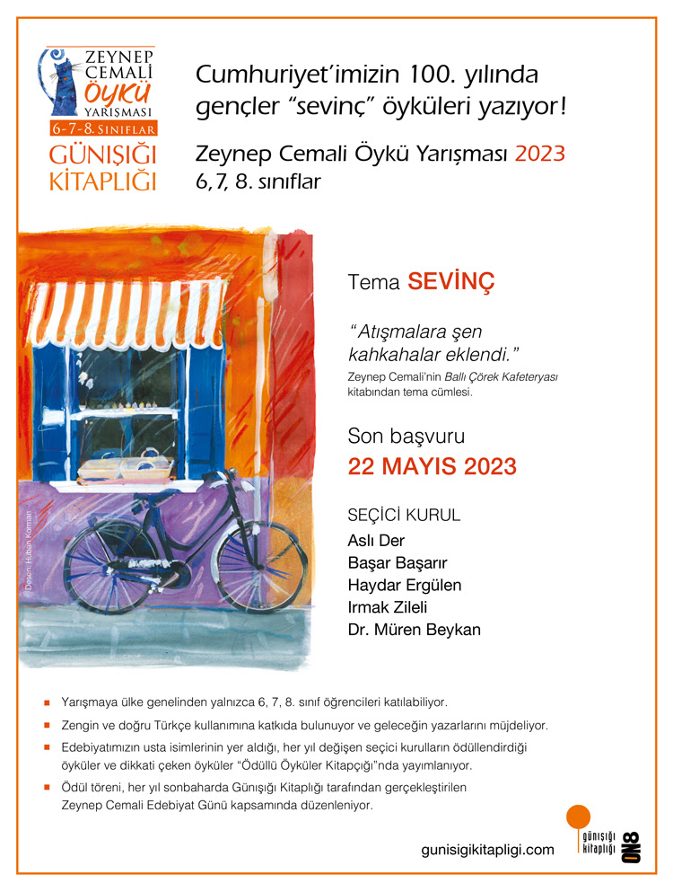 Cumhuriyet’in 100. yılında SEVİNÇ öyküleri yazılıyor Ocak 4, 2023Aralık 12, 2022 yazar admin Günışığı Kitaplığının düzenlediği Zeynep Cemali Öykü Yarışması’nın 2023 teması “Sevinç” olarak açıklandı. edebiyathaber.net (12 Aralık 2022) Yayın ve psikoloji dünyasını sarsan kayıpÇehov’un gençliği film oluyorKati Hirşel ABD'nin saygın edebiyat dergisinin 2013 seçkisindeMeksikalı yazar Carlos Fuentes yaşamını yitirdiHasan Saraç Picasso'nun yaşamı ve yapıtları üzerine yazdı: "Modernizm arenasında bir Minotaur"İşte, 2015 yılının en çok satan 10 e-kitabı!