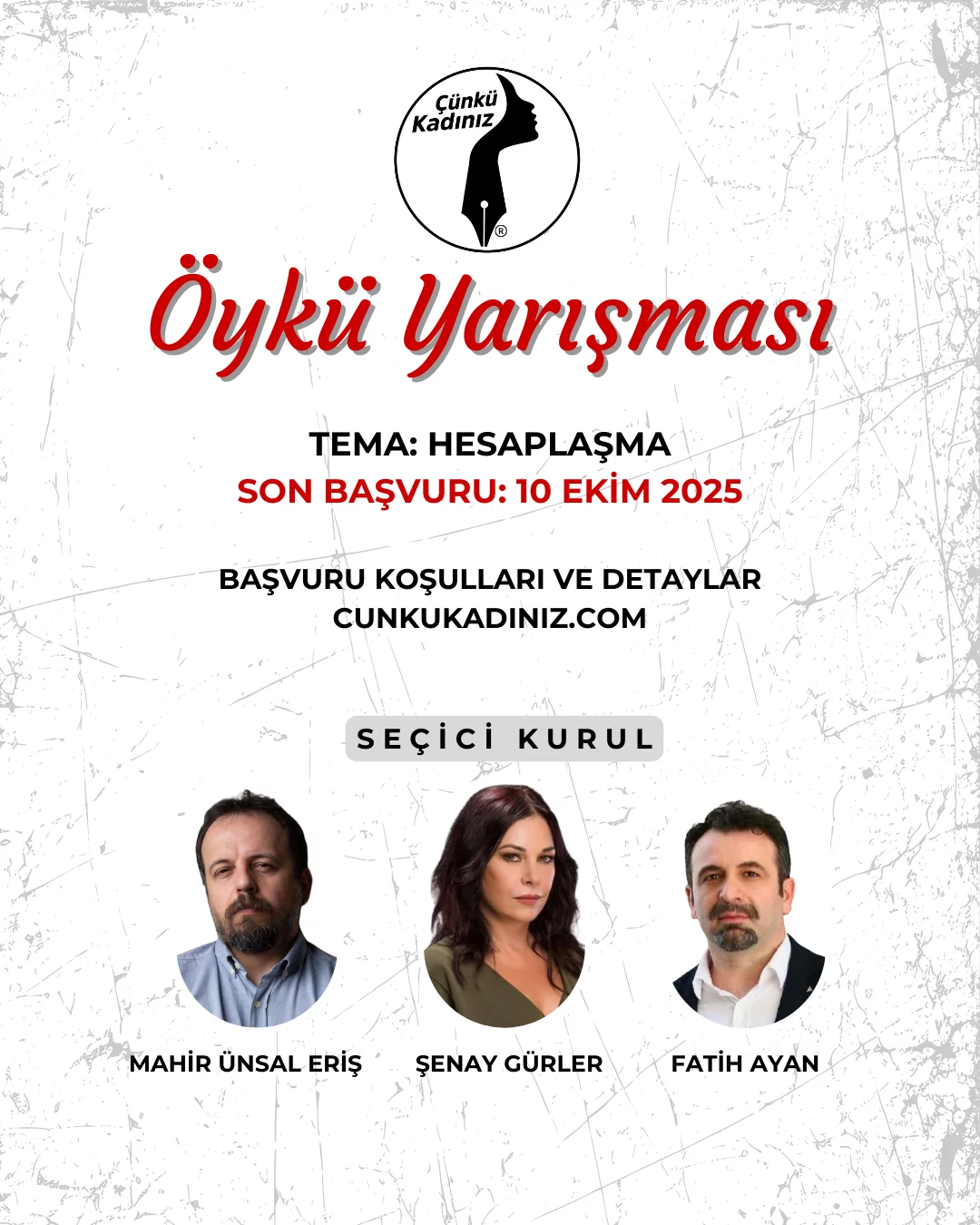 Çünkü Kadınız Kolektifi 1. Öykü Yarışması’na başvurular başladı. Çünkü Kadınız Kolektifi 1. Öykü Yarışması’nın teması: “Hesaplaşma”. Son başvuru tarihi, 10 Ekim 2025.