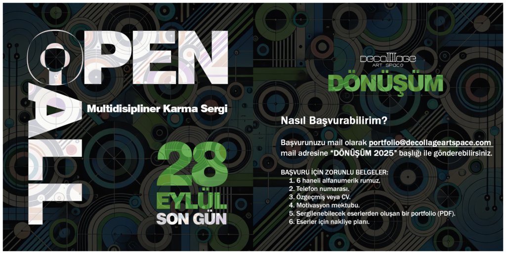 Decollage Art Space’in 17 Aralık’ta izleyiciyle buluşacak “Dönüşüm” temalı sergisi için açık çağrı süreci başladı. Multidisipliner sergiye 28 Eylül tarihine dek başvurabilirsiniz. Jüri tarafından “dönüşüm” teması kapsamında değerlendirilecek başvurular sanatçıların katılımını bekliyor.