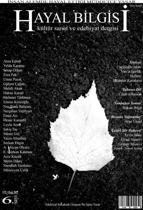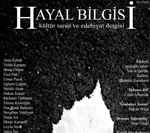Dergi: Hayal Bilgisi Ocak 4, 2023Ocak 19, 2011 yazar admin Van Erciş merkezli kültür, sanat ve edebiyat dergisi “Hayal Bilgisi”, dört aylık bir aranın ardından, altıncı sayısıyla okurlarının karşısında. Mutsuz metropol insanlarının öyküleri | Serkan ParlakApollianire davası "askıya alındı"Boğaçhan Sözmen: “Müzikli Türkiye Takvimi, ülkede yaşananları, müzikteki dönüşümle koşut anlattığımı...“Ben Okurum”un yeni bölüm konuğu Yasemin SungurÇocuklar için Sinema Atölyesi 4 Ekim’de başlıyorİşte, en iyi yerli polisiye filmler!