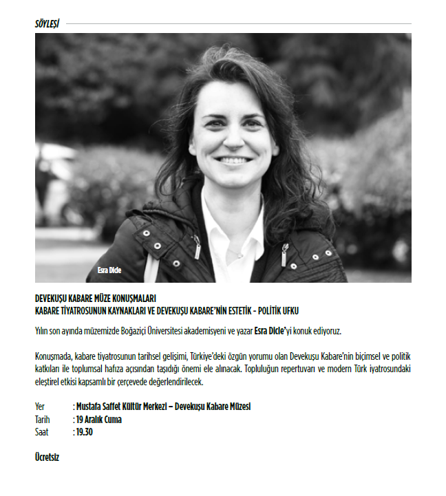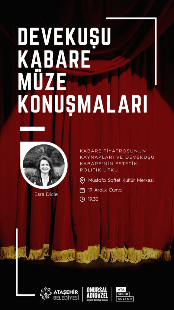 Devekuşu Kabare Müze Konuşmaları 19 Aralık’ta Aralık 16, 2025 yazar edebiyathaber Esra Dicle’nin konuşmacı olacağı Devekuşu Kabare Müze Konuşmaları 19 Aralık’ta Mustafa Saffet Kültür Merkezi’nde saat 19.30’da gerçekleşecek. Pulitzer'de romana verilecek ödül yok!Dag Solstad hayranlarına gelsinKendi çölünde kaybolanların hikâyesi: Leyla ile Mecnun | Gizem DemirRuhunu kaybetmiş dünyada büyü arayışı | Emek ErezBu devirde beton gibi kitabı kim okur?Julia Kristeva: Anlamlandırılamayanla Yüzleşmek Etkinliği 29 Eylül'de
