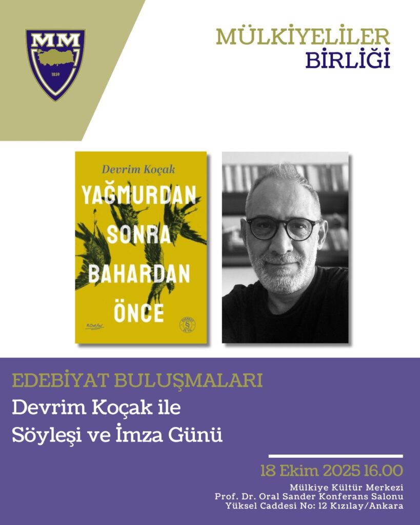 Devrim Koçak 18 Ekim’de Mülkiyeliler Birliği’nde okurlarıyla buluşuyor Ekim 14, 2025 yazar edebiyathaber Devrim Koçak 18 Ekim’de Mülkiyeliler Birliği’nde son kitabı Yağmur’dan Sonrayla okurlarıyla buluşuyor. Etkinlik saat 16.00’da gerçekleşecek. Türkiye'de büyümenin hikâyesi: Bırak Üzülsünler"Çocuklarda Utancı Anlamak için Basit Rehber" raflardaEdgar Allan Poe'nun gizemli dünyasıKalabalıkta Yüzler'in yeni baskısı yayımlandıEnver Ercan'ın 1984-1994 yılları arasında şairlerle yaptığı söyleşilerTürkan Elçi'nin ilk şiir kitabı okurla buluştu: Sen Şarkına Devam Et