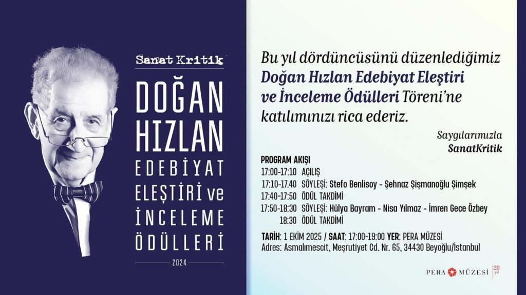 Doğan Hızlan Edebiyat Eleştiri ve İnceleme Ödülleri töreninin dördüncüsü, bu yıl, 1 Ekim 2025’te Pera Müzesi’nde yapılacak Eylül 30, 2025 yazar edebiyathaber Doğan Hızlan Edebiyat Eleştiri ve İnceleme Ödülleri töreninin dördüncüsü, bu yıl, 1 Ekim 2025’te Pera Müzesi’nde yapılacak. Etkinlik saat 17.00’de başlayacak. “Bir Şehir Kurmak: Ankara 1923-1933” Sergisi Müze Gazhane'de açıldıTürkiye’nin 100 yıllık müzikal panoraması Müze Gazhane’deOrhan Kemal 100 yaşındaMurathan Mungan Sempozyumu 24 -25 Nisan arasında gerçekleşecek"Aydınlar: Türkiye sinemasında entelektüel figürü ve ötekiler" söyleşisi 15 Mayıs'taKitap Kurtları Kulübü ekim konuğu Necati Tosuner